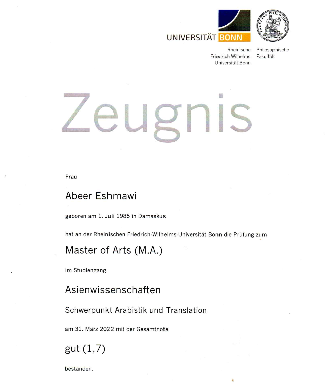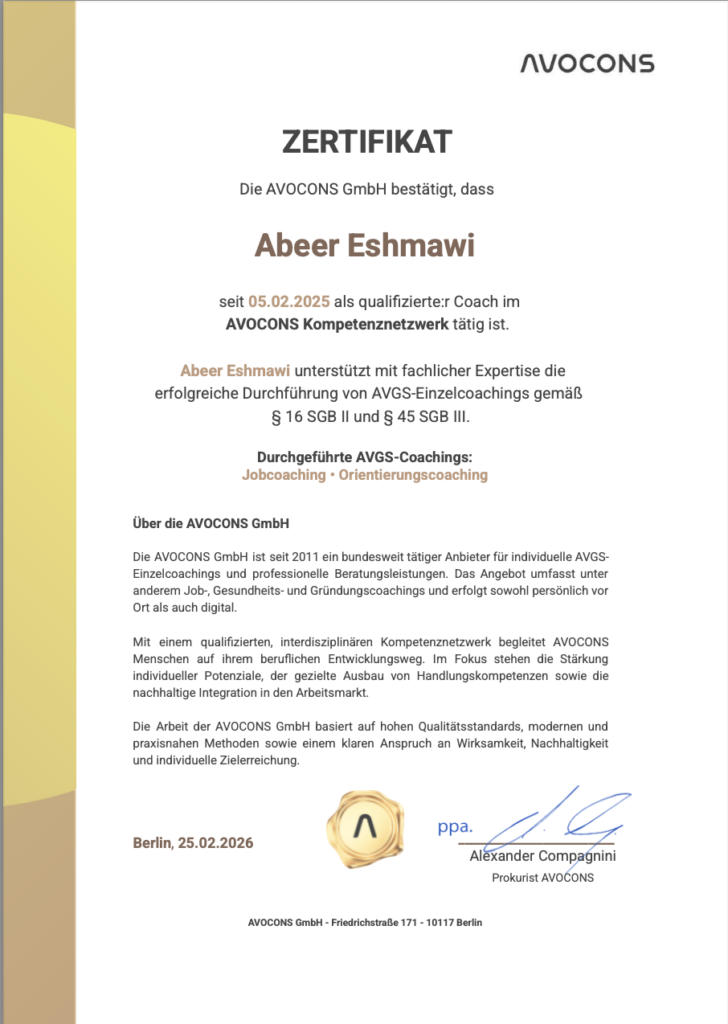 My name is Abeer Eshmawi. My mother tongue is Arabic. I am a language teacher and interpreter with several years of experience in this field. Since September 2023 I have been offering language courses, coaching and tutoring in my rooms in the city of Düsseldorf under BZ-Bildungsweg-Zentrum UG.